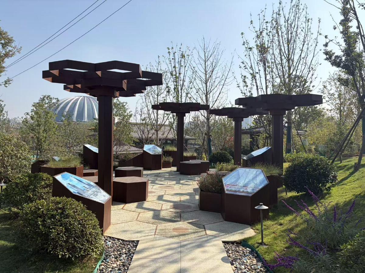 在規(guī)劃設(shè)計(jì)上,黃石園突破傳統(tǒng)造園思路,創(chuàng)新性將礦業(yè)歷史、轉(zhuǎn)型故事與場(chǎng)地空間相融合,功能分區(qū)清晰,景點(diǎn)命名獨(dú)具巧思。設(shè)計(jì)團(tuán)隊(duì)充分尊重場(chǎng)地原有地形地貌,讓展園與周邊環(huán)境自然銜接、相映成趣。同時(shí),創(chuàng)新運(yùn)用耐候鋼、采礦原石等新材料,引入原位生態(tài)修復(fù)新工藝,為礦山生態(tài)修復(fù)與工業(yè)文化景觀營(yíng)造提供了可借鑒的范本,實(shí)現(xiàn)了文化傳承與技術(shù)創(chuàng)新的有機(jī)統(tǒng)一。
