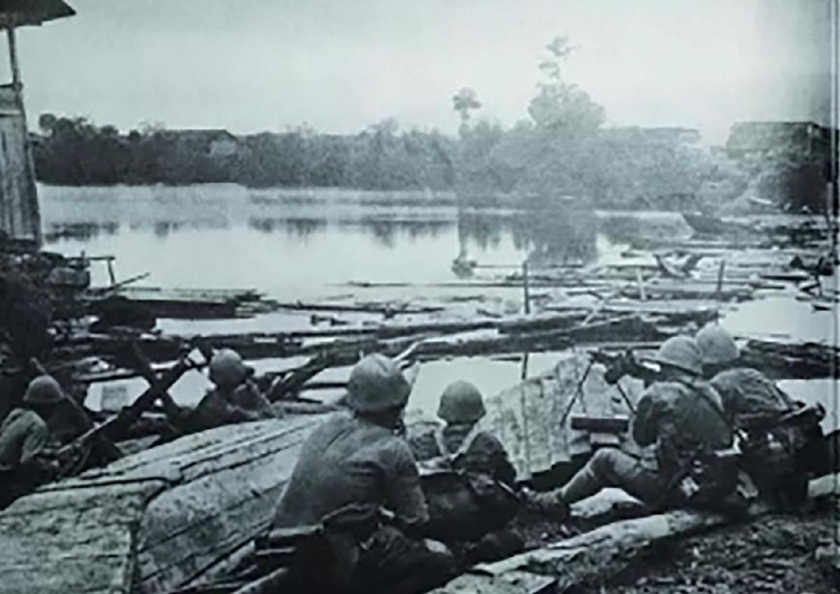 1938年10月2日,富水河岸。侵華日軍藤岡部隊(duì)的機(jī)槍手正在向中國(guó)守軍掃射。