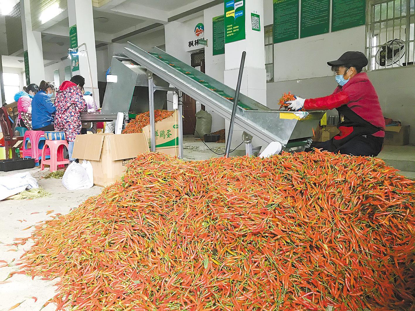 走進村農(nóng)產(chǎn)品加工園區(qū),車間堆滿火紅的朝天椒,幾名婦女站在機器傳送帶兩側(cè),手指如蜻蜓點水般嫻熟地分揀,優(yōu)質(zhì)椒裝袋外銷,品相稍差的進入清洗池準備制成辣椒醬。