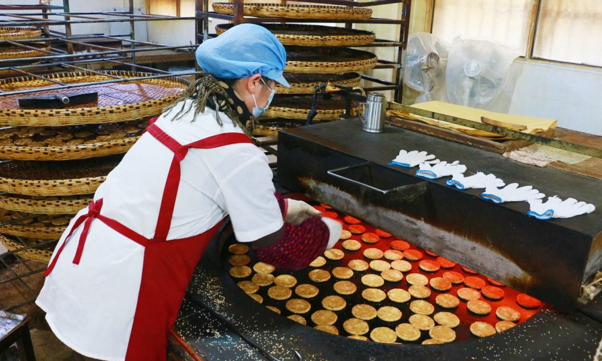 工人正在為烘烤的港餅翻面